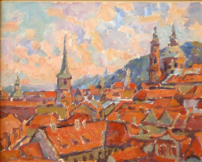This small gem like oil painting on panel was painted directly from nature in Prague by Leif Nilsson during a painting trip to the Czech Republic in the spring of 1999. The panel measures 8 inches by 10 inches unframed and is 13 inches by 15 inches in the handmade metal leafed finished corner wooden frame. The area where the composition was created is directly below the Hrad, or Castle on the eastern side of the River Vltava, where extensive gardens are terraced up along the hill leading to the Castle. Please click on the thumbnail image above to view more detailed images of this painting. To see more paintings of the Czech Republic by Leif Nilsson click here.