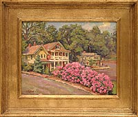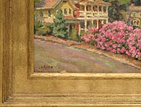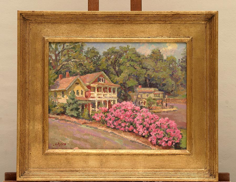 corner frame shown here. CAT# 2545 Up Spring Street with Rhododendrons (framed view) oil paint on linen canvas 11 x 14 inches unframed Leif Nilsson spring 2003 © Sold |